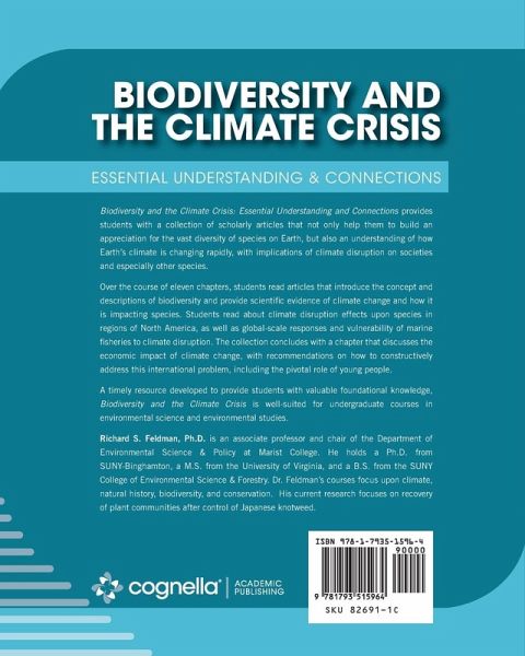 Biodiversity and the Climate Crisis: Essential Understanding and Connections provides students with a collection of scholarly articles that not only help them to build an appreciation for the vast diversity of species on Earth, but also an understanding of how Earth's climate is changing rapidly, with implications of climate disruption on societies and especially other species. Over the course of eleven chapters, students read articles that introduce the concept and descriptions of biodiversity and provide scientific evidence of climate change and how it is impacting species. Students read about climate disruption effects upon species in regions of North America, as well as global-scale responses and vulnerability of marine fisheries to climate disruption. The collection concludes with a chapter that discusses the economic impact of climate change, with recommendations on how to constructively address this international problem, including the pivotal role of young people. The revised first edition features full color photos, charts, graphs, and maps. A timely resource developed to provide students with valuable foundational knowledge, Biodiversity and the Climate Crisis is well-suited for undergraduate courses in environmental science and environmental studies. Richard S. Feldman, Ph.D. is an associate professor and chair of the Department of Environmental Science & Policy at Marist College. He holds a Ph.D. from SUNY-Binghamton, a M.S. from the University of Virginia, and a B.S. from the SUNY College of Environmental Science & Forestry. Dr. Feldman's courses focus upon climate, natural history, biodiversity, and conservation. His current research focuses on recovery of plant communities after control of Japanese knotweed.