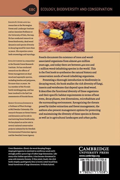 Fossils document the existence of trees and wood-associated organisms from almost 400 million years ago, and today there are between 400,000 and 1 million wood-inhabiting species in the world. This is the first book to synthesise the natural history and conservation needs of wood-inhabiting organisms. Presenting a thorough introduction to biodiversity in decaying wood, the book studies the rich diversity of fungi, insects and vertebrates that depend upon dead wood. It describes the functional diversity of these organisms and their specific habitat requirements in terms of host trees, decay phases, tree dimensions, microhabitats and the surrounding environment. Recognising the threats posed by timber extraction and forest management, the authors also present management options for protecting and maintaining the diversity of these species in forests as well as in agricultural landscapes and urban parks.