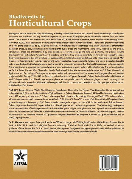 Among the natural resources, plant biodiversity is the key to human existence and survival. Horticultural crops contribute to nutritional and livelihood security. Mankind depends on near about 5000 plant species worldwide to meet food and other needs. This number is just a fraction of total world flora of 2.5 lakh species of mosses, ferns, conifers and flowering plants. More than 50,000 plant species are meeting the food (calories) needs of human world wide. There is still greater dependence on a few plant species; 20 to 30 in global context. Horticultural crops encompass fruit crops, vegetables, ornamentals, plantation crops, spices, aromatic and medicinal plants, tuber crops and mushrooms. Temperate, subtropical and tropical horticultural crops are characterized by their adoption to varying ecology and land use patterns. The present volume 'Biodiversity in Horticultural Crops' has 18 chapters contributed by eminent scientists working in the respective crops. Biodiversity is conceived as gift of nature for sustainability, nutritional security and above all to widen the food basket. Man lives not for food alone, but to enjoy nature's gift-fruits, vegetables, flowering plants, foliages and so on. Genes for desirable traits are embedded in biodiversity and as such the present the volume thrown open horticultural bioresources to human benefit. The present volume emphasis current and widely grown horticultural crops in India in all its biodiversity. The volume is edited by Dr K V Peter, Former Vice-Chancellor and current Professor of Horticulture, Kerala Agricultural University. As vegetable breeder at G B Pant University of Agriculture and Technology, Pantnagar he surveyed, collected, documented and conserved working germplasm of tomato, brinjal and chili. During 1991-1998, as Director, Indian Institute of Spices Research, Calicut, he facilitated establishment of worlds largest collection of black pepper germ plasm. Working collections of cardamom, ginger, turmeric, nutmeg, clove, allspice and vanill were also felicitated to be organized. He also co-authored descriptors of black pepper and cardamom published by IPGRI, Rome.