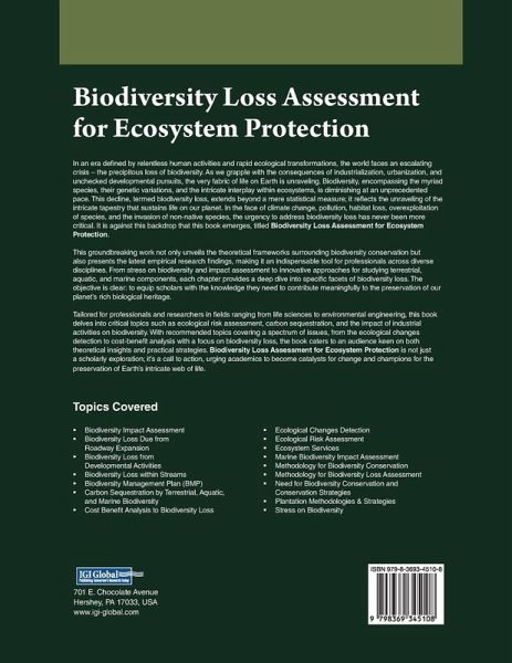 In an era defined by relentless human activities and rapid ecological transformations, the world faces an escalating crisis - the precipitous loss of biodiversity. As we grapple with the consequences of industrialization, urbanization, and unchecked developmental pursuits, the very fabric of life on Earth is unraveling. Biodiversity, encompassing the myriad species, their genetic variations, and the intricate interplay within ecosystems, is diminishing at an unprecedented pace. This decline, termed biodiversity loss, extends beyond a mere statistical measure; it reflects the unraveling of the intricate tapestry that sustains life on our planet. In the face of climate change, pollution, habitat loss, overexploitation of species, and the invasion of non-native species, the urgency to address biodiversity loss has never been more critical. It is against this backdrop that this book emerges, titled Biodiversity Loss Assessment for Ecosystem Protection . This groundbreaking work not only unveils the theoretical frameworks surrounding biodiversity conservation but also presents the latest empirical research findings, making it an indispensable tool for professionals across diverse disciplines. From stress on biodiversity and impact assessment to innovative approaches for studying terrestrial, aquatic, and marine components, each chapter provides a deep dive into specific facets of biodiversity loss. The objective is clear: to equip scholars with the knowledge they need to contribute meaningfully to the preservation of our planet's rich biological heritage.