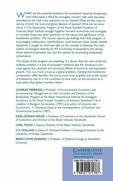What potential problems does biodiversity loss create for humankind? What basis is there for biologists' concern about what has been described as the sixth mass extinction on our planet? The Biodiversity Programme of the Royal Swedish Academy of Sciences' Beijer Institute brought together eminent economists and ecologists to consider these and other questions about the nature and significance of the problem of biodiversity loss. This volume reports key findings from that programme. In encouraging collaborative interdisciplinary work between the closely related disciplines of economics and ecology, programme participants hoped to shed new light on the concept of diversity, the implications of biological diversity for the functioning of ecosystems, the driving forces behind biodiversity loss, and the options for promoting biodiversity conservation. The results of the programme are surprising. They indicate that the main costs of biodiversity loss may not be the loss of genetic material, but the loss of ecosystem resilience and the insurance it provides against the uncertain environmental effects of economic and population growth. Because this is as much a local as a global problem, biodiversity conservation offers both local and global benefits. Since the causes of biodiversity loss lie in the incentives to local users, that is where reform must begin if the problem is to be tackled successfully.