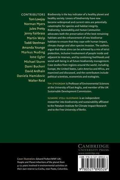 Biodiversity is the key indicator of a healthy planet and healthy society. Losses of biodiversity have now become widespread and current rates are potentially catastrophic for species and habitat integrity. Biodiversity, Sustainability and Human Communities advocates both the preservation of the best remaining habitats and the enhancement of new biodiverse habitats to ensure that they cope with human impact, climate change and alien species invasion. The authors argue that these aims can be achieved by a mix of strict protection, inclusive involvement of people inside and adjacent to reserves, and by combining livelihoods and social well-being in all future biodiversity management. Case studies from regions around the world, including Europe, the United States, Latin America and Africa are examined and discussed, and the contributors include political scientists, economists and ecologists.
