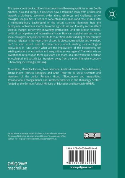 This open access book focuses on the meanings, agendas, as well as the local and global implications of bioeconomy and bioenergy policies in and across South America, Asia and Europe. It explores how a transition away from a fossil and towards a bio-based economic order alters, reinforces and challenges socio-ecological inequalities. The volume presents a historically informed and empirically rich discussion of bioeconomy developments with a particular focus on bio-based energy. A series of conceptual discussions and case studies with a multidisciplinary background in the social sciences illuminate how the deployment of biomass sources from the agricultural and forestry sectors affect societal changes concerning knowledge production, land and labour relations, political participation and international trade. How can a global perspective on socio-ecological inequalities contribute to a complex and critical understanding of bioeconomy? Who participates in the negotiation of specific bioeconomy policies and who does not? Who determines the agenda? To what extent does the bioeconomy affect existing socio-ecological inequalities in rural areas? What are the implications of the bioeconomy for existing relations of extraction and inequalities across regions? The volume is an invitation to reflect upon these questions and more, at a time when the need for an ecological and socially just transition away from a carbon intensive economy is becoming increasingly pressing.