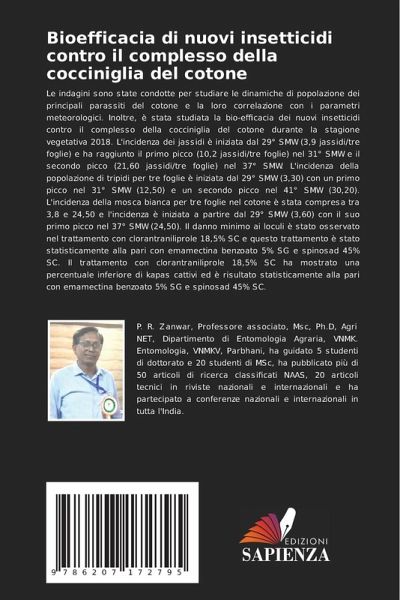Le indagini sono state condotte per studiare le dinamiche di popolazione dei principali parassiti del cotone e la loro correlazione con i parametri meteorologici. Inoltre, è stata studiata la bio-efficacia dei nuovi insetticidi contro il complesso della cocciniglia del cotone durante la stagione vegetativa 2018. L'incidenza dei jassidi è iniziata dal 29° SMW (3,9 jassidi/tre foglie) e ha raggiunto il primo picco (10,2 jassidi/tre foglie) nel 31° SMW e il secondo picco (21,60 jassidi/tre foglie) nel 37° SMW. L'incidenza della popolazione di tripidi per tre foglie è iniziata dal 29° SMW (3,30) con un primo picco nel 31° SMW (12,50) e un secondo picco nel 41° SMW (30,20). L'incidenza della mosca bianca per tre foglie nel cotone è stata compresa tra 3,8 e 24,50 e l'incidenza è iniziata a partire dal 29° SMW (3,60) con il suo primo picco nel 37° SMW (24,50). Il danno minimo ai loculi è stato osservato nel trattamento con clorantraniliprole 18,5% SC e questo trattamento è stato statisticamente alla pari con emamectina benzoato 5% SG e spinosad 45% SC. Il trattamento con clorantraniliprole 18,5% SC ha mostrato una percentuale inferiore di kapas cattivi ed è risultato statisticamente alla pari con emamectina benzoato 5% SG e spinosad 45% SC.