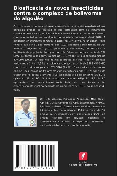 As investigações foram realizadas para estudar a dinâmica populacional das principais pragas do algodão e sua correlação com os parâmetros climáticos. Além disso, a bioeficácia dos inseticidas mais recentes contra o complexo de bollworms no algodão foi estudada durante a Kharif 2018. A incidência de jassídeos começou a partir do 29º SMW (3,9 jassídeos / três folhas), que atingiu seu primeiro pico (10,2 jassídeos / três folhas) no 31º SMW e o segundo pico (21,60 jassídeos / três folhas) no 37º SMW. A incidência da população de tripes por três folhas começou a partir do 29º SMW (3,30) com o seu primeiro pico no 31º SMW (12,50) e o segundo pico no 41º SMW (30,20). A incidência de mosca branca por três folhas no algodão variou entre 3,8 e 24,50 e a incidência começou a partir do 29º SMW (3,60) com o seu primeiro pico no 37º SMW (24,50). Foram observados danos mínimos nos lóculos no tratamento com clorantraniliprole 18,5 % SC e este tratamento foi estatisticamente igual ao benzoato de emamectina 5% SG e spinosad 45 % SC. O tratamento com clorantraniliprole 18,5 % SC apresentou uma percentagem mais baixa de más kapas e foi estatisticamente igual ao benzoato de emamectina 5% SG e ao spinosad 45 % SC.