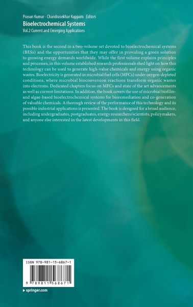Part 1. Bio-electrochemical systems for biofuels and biochemicals.- 1. Photosynthetic Microbial Fuel Cells: Fundamentals and Potential Applications.- 2. Algal bio-cathodes in aid of bio-energy generation, bio-remediation and nutrient removals.- 3. Hydrogen and methane production in Bio-electrochemical systems.- 4. Hydrogen and methane generation from bio-waste: enhancement and upgrading via bioelectrochemical systems.- 5. Bio-electrochemical systems/technology for Energy and waste treatment.- 6. Bio-electrochemical for Energy and waste treatment via suitable microbial systems.- 7. Bio-electrochemical remediation of organic pollutants.- 8. Electrosynthesis of various chemicals.- Part 2. Recognition of bio-electrochemical systems in real life.- 9. Industrial applications of bio-electrochemical system: wastewater treatment and others.- 10. Applications of bio-electrochemical systems in metal recovery.- 11. Integrating waste management with MFC.- 12. Bio-electrochemical technology:Challenges and Implications.- 13. High value-added compounds (oligomers from hemicellulose) using microwaves pretreatment of electrochemical Processes.- 14. Rice paddy field microbial fuel cells: fundamentals and recent progresses.- 15. Effective Cathode Catalysts for Oxygen Reduction Reactions in Microbial Fuel Cell.- 16. Hydrogen production and contaminants removal using microbial electrochemical cells.