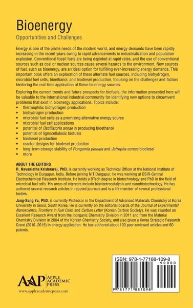 Energy is one of the prime needs of the modern world, and energy demands have been rapidly increasing in the recent years owing to rapid advancements in industrialization and population explosion. Conventional fossil fuels are being depleted at rapid rates, and the use of conventional sources such as coal or nuclear sources cause several hazards to the environment. New sources of fuel, such as bioenergy, are an ideal option for fulfilling ever-increasing energy demands. This important book offers an exploration of these alternate fuel sources, including biohydrogen, microbial fuel cells, bioethanol, and biodiesel production, focusing on the challenges and factors hindering the real-time application of these bioenergy sources. Researchers all over the world are working in this energy sector, and this has led to drastic improvements in bioenergy research. However, the technology gap between research and industrial application still exists. This important book offers engineers and technologists from different disciplines valuable information on this multifaceted field. The field of bioenergy is interdisciplinary, requiring the knowledge of biologists, chemists, physicists, and engineers. Exploring the current trends and future prospects for biofuels, the information presented in this book will be valuable to the international industrial community for identifying new options to circumvent problems that exist in bioenergy applications. Topics include: ¿ Thermophilic biohydrogen production ¿ Bio-hydrogen production ¿ Microbial fuel cells as a promising alternative energy source ¿ Microbial fuel cell applications ¿ Potential of Pscillatoria annae in producing bioethanol ¿ Potential of lignocellulosic biofuels ¿ Biodiesel production ¿ Reactor designs for biodesel production ¿ Long-term storage stability of Pongamia pinnata and Jatropha curcus biodiesel