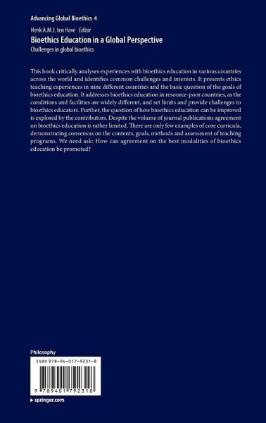 Chapter 1: Henk ten Have; Introduction. Globalization of bioethics education.- Part I: Ethics teaching experiences around the globe.- Chapter 2: William Saad Hossne and Leo Pessini; Bioethics education in Brazil.- Chapter 3: Vina Vaswani and Ravi Vaswani: Bioethics education in India.- Chapter 4: Toshitaka Adachi; Bioethics education in Japan: Ethics education for medical and nursing students.- Chapter 5: Ademola J. Ajuwon; Access to bioethics education in Nigeria: Past history, current situation, and opportunities for the future.- Chapter 6: Nada Adeeb Omar ElTaiba; Teaching ethics to social work students in Qatar: a vibrant challenge.- Chapter 7: Hongqi Wang and Xin Wang; Medical ethics education in China.- Part II: Ethics education for professionals.- Chapter 8: Paul Ndebele; The goal of ethics education in institutions of higher learner. The case of the University of Botswana.- Chapter 9: Bahaa Darwish; How effective can ethics education be?.- Chapter 10: Rosemary Donley: Teaching ethics to nurses.- Part III: Educating bioethics in resource-poor countries.- Chapter 11: Claude Vergès; Teaching bioethics in the socio-ecological context of resource-poor countries.- Chapter 12: Leonardo de Castro and Sarah Jane Toledano; Bioethics education in resource-challenged countries in resource-challenged countries.- Part IV: Can bioethics education be improved?.- Chapter 13: Berna Arda; Ways to improve bioethics education.- Chapter 14: Bert Gordijn; Moral improvement through ethics education.- Chapter 15: Volnei Garrafa, Natan Monsores and Claudio Lorenzo; Challenges for bioethics education in Brazil - adapting the core curriculum of UNESCO for critical practice.- Chapter 16: Jan Helge Solbakk; Movements and movies in bioethics: The use of theatre and cinema in teaching bioethics.