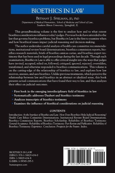 "Bioethics in Law helpfully collects judicial, opinions considering bioethics material, testimony, and briefs to explore the ways in which bioethics is entering U.S. courtrooms. ... Spielman aims this book first at lawyers and bioethics but writes accessibly for a broader audience. The book will advance the conversation on the relationship between law and bioethics. ... Bioethics in Law offers a treasure trove of information that cannot readily be found elsewhere shedding light on the complex interaction between bioethics and law." (Susan M. Wolf, New England Journal of Medicine, Vol. 46 (32), 2007)