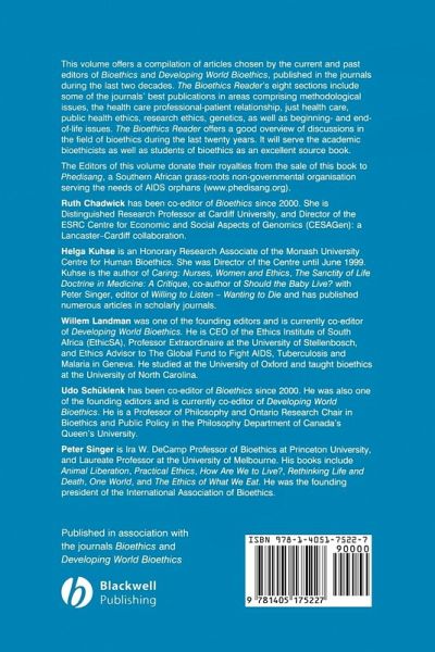 This volume offers a compilation of articles chosen by the current and past editors of Bioethics and Developing World Bioethics, published in the journals during the last two decades. The Bioethics Reader's eight sections include some of the journals' best publications in areas comprising methodological issues, the health care professional-patient relationship, just health care, public health ethics, research ethics, genetics, as well as beginning- and end-of-life issues. The Bioethics Reader offers a good overview of discussions in the field of bioethics during the last twenty years. It will serve the academic bioethicists as well as students of bioethics as an excellent source book. The Editors of this volume donate their royalties from the sale of this book to Phedisang, a Southern African grass-roots non-governmental organisation serving the needs of AIDS orphans (www.phedisang.org).