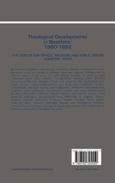 As the field of bioethics has matured, increasing attention is being paid to how bioethical issues are treated in different moral and religious traditions and in different regions of the world. It is often difficult, however, to obtain accurate information about these matters. The Bioethics Yearbook series provides interested parties with analyses of how such issues as new reproductive techniques, abortion, maternal-fetal conflicts, care of seriously ill newborns, consent, confidentiality, equitable access, cost-containment, withholding and withdrawing treatment, active euthanasia, the definition of death, and organ transplantation are being discussed in different religious traditions and regions. Volume Three discusses theological developments from 1990--1992 in Anglican, Baptist, Buddhist, Catholic, Continental Protestant, Eastern Orthodox, Hindu, Jewish, Latter-Day Saint, Lutheran, Methodist, Muslim, and Presbyterian traditions. Volume Four will continue coverage of official governmental and medical society policies on these topics throughout the world.