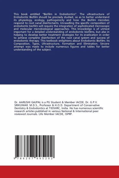 This book entitled "Biofilm in Endodontics". The ultrastructure of Endodontic Biofilm should be precisely studied, so as to better understand its physiology, ecology, pathogenicity and how the Biofilm microbes respond to root canal disinfectants. Unravelling the specific composition of endodontic biofilm will require the integration of sophisticated microscopic and molecular microbiological approaches. This knowledge is of utmost important for a detailed understanding of endodontic biofilms, but also in helping to develop better treatment strategies for its eradication in order to achieve complete disinfection of the root canal system and success of endodontic therapy. This textbook enlightens about Endodontic Biofilm; Its Composition, Types, Ultrastructure, Formation and Elimination. Sincere attempt was made to include numerous figures and tables for better understanding of the subject.