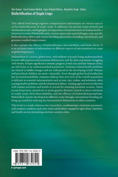This edited book brings together comprehensive information on various aspects of the biofortification of staple crops. It addresses the present status of food and nutritional security and highlights the importance of micronutrients in human health, a historical account of biofortification, current approaches and challenges, crop-specific biofortification efforts and various breeding approaches, including conventional, and genomics enabled improvement.