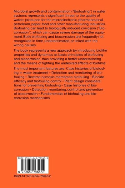Microbial growth and contamination ("Biofouling") in water systems represents a significant threat to the quality of waters produced for the microelectronic, pharmaceutical, petroleum, paper, food and other manufacturing industries. Biofouling can lead to biologically induced corrosion ("Biocorrosion"), which can cause severe damage to the equipment. Both biofouling and biocorrosion are frequently not recognized in time, underestimated, or linked with the wrong causes. The book represents a new approach by introducing biofilm properties and dynamics as basic principles of biofouling and biocorrosion, thus providing a better understanding and the means of fighting the undesired effects of biofilms. The most important features are: Case histories of biofouling in water treatment.- Detection and monitoring of biofouling.- Reverse osmosis membrane biofouling.- Biocide efficacy and biofouling control.- Plant design considerations for preventing biofouling.- Case histories of biocorrosion.- Detection, monitoring, control and prevention of biocorrosion.- Fundamentals of biofouling and biocorrosion mechanisms.