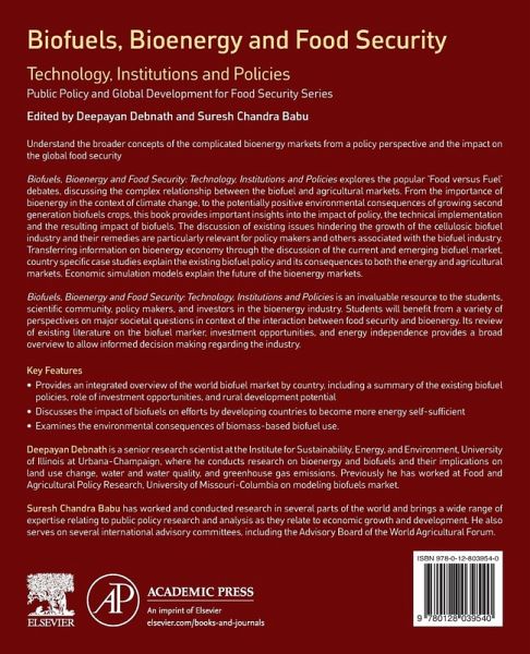 Biofuels, Bioenergy and Food Security: Technology, Institutions and Policies explores the popular 'Food versus Fuel' debates, discussing the complex relationship between the biofuel and agricultural markets. From the importance of bioenergy in the context of climate change, to the potentially positive environmental consequences of growing second generation biofuels crops, this book provides important insights into the impact of policy, the technical implementation and the resulting impact of biofuels. The discussion of existing issues hindering the growth of the cellulosic biofuel industry and their remedies are particularly relevant for policy makers and others associated with the biofuel industry.
