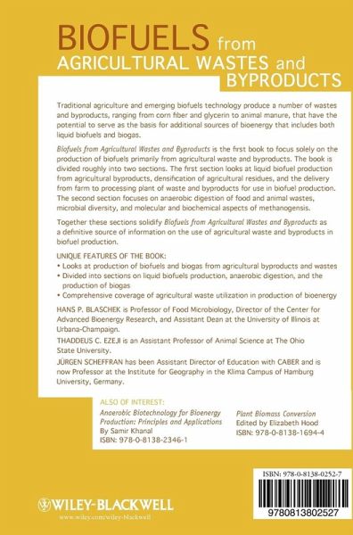 Biofuels from Agricultural Wastes and Byproducts is the first book to focus solely on the production of biofuels primarily from agricultural waste and by-products. The book is divided roughly into two sections. The first section looks at liquid biofuel production from agricultural byproducts, densification of…mehr