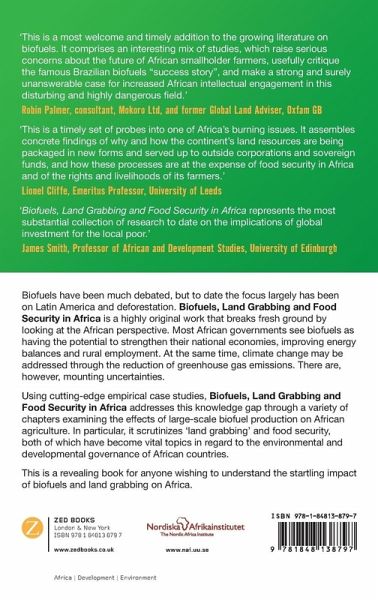 The issue of biofuels has already been much debated, but the focus to date has largely been on Latin America and deforestation - this highly original work breaks fresh ground in looking at the African perspective. Most African governments see biofuels as having the potential to increase agricultural productivity and export incomes and thus strengthen their national economies, improving energy balances and rural employment. At the same time climate change may be addressed through reduction of green house gas emissions. There are, however, a number of uncertainties mounting that challenge this scenario. Using cutting-edge empirical case studies, this knowledge gap is addressed in a variety of chapters examining the effects of large-scale biofuel production on African agriculture. In particular, 'land grabbing' and food security issues are scrutinised, both of which have become vital topics in regard to the environmental and developmental governance of African countries. A revealing book for anyone wishing to understand the startling impact of biofuels and land grabbing on Africa.