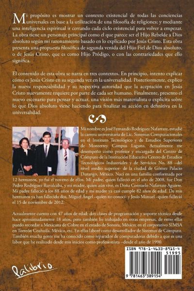Mi propósito es mostrar un contexto existencial de todas las conciencias universales en base a la utilización de una filosofía de religiones, y mediante una inteligencia espiritual ir cerrando cada ciclo existencial para volver a empezar. La obra tiene un personaje principal como el que parece ser el Hijo Rebelde a Dios absoluto según mi razonamiento basado en lo explicado por Jesús Cristo. Esta obra presenta una propuesta filosófica de segunda venida del Hijo Fiel de Dios absoluto, o de Jesús Cristo, que es como Hijo Pródigo, o con las contrariedades que ello significa. El contenido de esta obra se narra en tres contextos. En principio, intento explicar cómo es Jesús Cristo en su segunda vez en la universalidad. Posteriormente, explico la nueva responsabilidad y su respectiva autoridad que la aceptación en Jesús Cristo nuevamente requiere por parte de cada ser humano. Finalmente, presento el nuevo escenario para pensar y actuar, una visión más materialista o explícita sobre lo que Dios absoluto viene haciendo para finalizar su acción en definitiva en la universalidad.