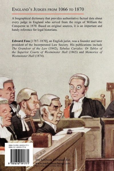 A biographical dictionary that provides authoritative factual data about every judge in England who served from the reign of William the Conqueror to 1870. Based on original sources, it is an important and handy reference for legal historians. Edward Foss [1787-1870], an English jurist, was a founder and later president of the Incorporated Law Society. His publications include The Grandeur of the Law (1842), Tabulae Curiales: Or Tables of the Superior Courts of Westminster Hall (1865) and Memories of Westminster Hall (1874).