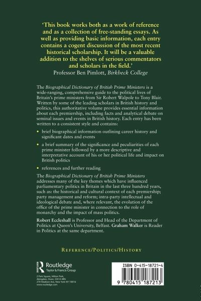 "The Biographical Dictionary of British Prime Ministers" is a wide-ranging, comprehensive guide to the political lives of Britain's Prime Ministers from Sir Robert Walpole to Tony Blair. Written by some of the leading authorities on British politics this authoritative dictionary provides essential information about each premiership, including facts and analytical debate. In addition to brief biographical information outlining career history and important dates and events, each entry contains a brief summary of the Prime Minister's significance and peculiarities, followed by a more descriptive and interpretative account of his or her political life and influence on British politics. Entries also include references and further reading. "The Biographical Dictionary of British Prime Ministers" addresses many of the key themes to understanding the role and impact of particular prime ministers such as: the political context; party management and reform; intra-party intellectual debate; and where relevant the evolution of the office of prime minister.