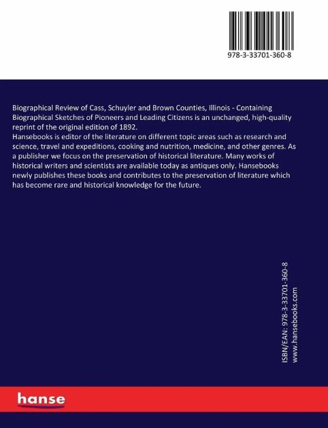 Biographical Review of Cass, Schuyler and Brown Counties, Illinois - Containing Biographical Sketches of Pioneers and Leading Citizens is an unchanged, high-quality reprint of the original edition of 1892.