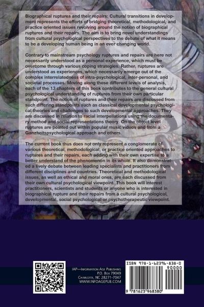 A volume in Advances in Cultural Psychology Series Editor: Jaan Valsiner, Aalborg University Biographical ruptures and their repairs: Cultural transitions in development represents the efforts of bridging theoretical, methodological, and practice oriented issues revolving around the notion of biographical ruptures and their repairs. The aim is to bring novel understandings from cultural psychological perspectives to the debate of what it means to be a developing human being in an ever changing world. Contrary to mainstream psychology ruptures and repairs are here not necessarily understood as a personal experience, which must be overcome through various coping strategies. Rather, ruptures are understood as experiences, which necessarily emerge out of the complex interrelatedness of intra-psychological, inter-personal, and societal processes. Moving along these different levels of analysis, each of the 13 chapters of this book contributes to the general cultural psychological understanding of ruptures from their own particular standpoint. The notion of ruptures and their repairs are discussed from such differing standpoints such as classical developmental psychological theories and challenges to such developmental approaches. They are discussed in relation to racial interpellations using the documentary method and social representations theory. On the object level ruptures are pointed out within popular music videos and from a Ganzheitspsychological approach and others. The current book thus does not only represent a conglomerate of various theoretical, methodological, or practice oriented approaches to ruptures and their repairs, each adding with their own expertise to a better understand of the phenomenon in its whole. It also demonstrated a lively debate between leading specialists and practitioners from different disciplines and countries. Theoretical and methodological issues, as well as ethical and moral ones, are each discussed from their own cultural psychological viewpoint. This book will interest practitioners, scientists and students or anyone who is interested in biographical rupture and their repairs from a cultural psychological, developmental, social psychological or psychotherapeutic viewpoint.