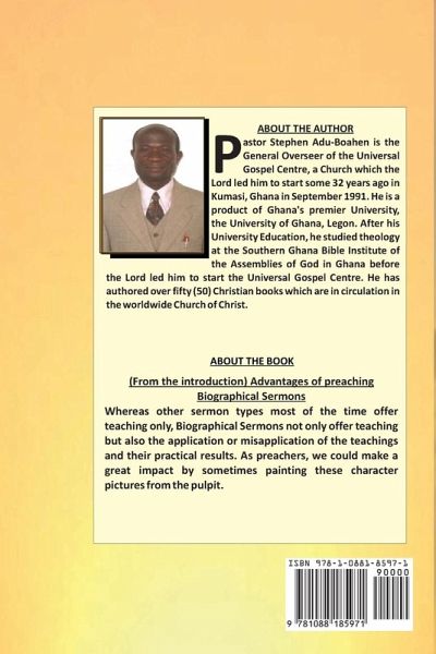 Biographical Sermon Outlines for all Preachers offer an inexhaustible source of sermons to faithful preachers of God's Word. The Bible contains over 3,000 different male characters. There are also several female characters in both the Old and New Testaments. If we decide to preach only one sermon on each of these 3,000 men characters alone, (which can never be possible because of the several events in their lives) it will take us not less than 60 years to do this. So if you come into the ministry at 30 years of age, by the time you finish all the sermons on only the Bible men characters you will be over 90 years and will be enjoying your retirement somewhere if the Lord has not already called you home!...Preparing and preaching Biographical Sermons on the suggested men and women characters in this book can also go a long way to help us improve upon our preaching. This can help us to vary the Biographical Sermons we can prepare and preach on our own by giving us extra 140 Sermons.'