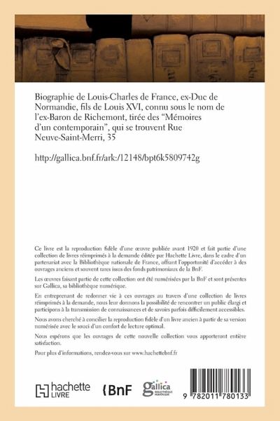 Biographie de Louis-Charles de France, ex-Duc de Normandie, fils de Louis XVI, connu sous le nom de l'ex-Baron de Richemont, tirée des "Mémoires d'un contemporain", qui se trouvent Rue Neuve-Saint-Merri, 35 Date de l'édition originale: 1848 Sujet de l'ouvrage: Richemont, Henri-Éthelbert-Louis-Heect.-Alb. Hébert, dit le baron de Le présent ouvrage s'inscrit dans une politique de conservation patrimoniale des ouvrages de la littérature Française mise en place avec la BNF. HACHETTE LIVRE et la BNF proposent ainsi un catalogue de titres indisponibles, la BNF ayant numérisé ces oeuvres et HACHETTE LIVRE les imprimant à la demande. Certains de ces ouvrages reflètent des courants de pensée caractéristiques de leur époque, mais qui seraient aujourd'hui jugés condamnables. Ils n'en appartiennent pas moins à l'histoire des idées en France et sont susceptibles de présenter un intérêt scientifique ou historique. Le sens de notre démarche éditoriale consiste ainsi à permettre l'accès à ces oeuvres sans pour autant que nous en cautionnions en aucune façon le contenu. Pour plus d'informations, rendez-vous sur www.hachettebnf.fr