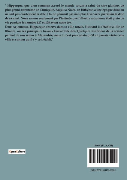 " Hipparque, que d¿un commun accord le monde savant a salué du titre glorieux de plus grand astronome de l¿antiquité, naquit à Nicée, en Bithynie, à une époque dont on ne sait pas exactement la date. On ne pourrait pas non plus fixer avec précision la date de sa mort. Nous savons seulement par Ptolémée que l¿illustre astronome était plein de vie pendant les années 127 et 128 avant notre ère. Dans sa jeunesse, Hipparque observa dans sa ville natale. Plus tard il s¿établit à l¿île de Rhodes, où ses principaux travaux furent exécutés. Quelques historiens de la science parlent de son séjour à Alexandrie, mais il n¿est pas certain qüil ait jamais visité cette ville et surtout qüil s¿y soit établi."