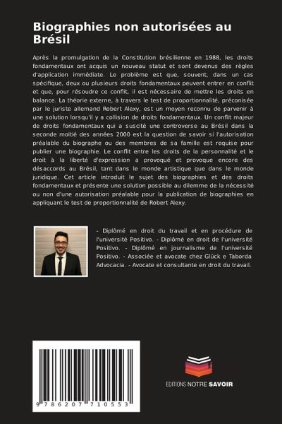 Après la promulgation de la Constitution brésilienne en 1988, les droits fondamentaux ont acquis un nouveau statut et sont devenus des règles d'application immédiate. Le problème est que, souvent, dans un cas spécifique, deux ou plusieurs droits fondamentaux peuvent entrer en conflit et que, pour résoudre ce conflit, il est nécessaire de mettre les droits en balance. La théorie externe, à travers le test de proportionnalité, préconisée par le juriste allemand Robert Alexy, est un moyen reconnu de parvenir à une solution lorsqu'il y a collision de droits fondamentaux. Un conflit majeur de droits fondamentaux qui a suscité une controverse au Brésil dans la seconde moitié des années 2000 est la question de savoir si l'autorisation préalable du biographe ou des membres de sa famille est requise pour publier une biographie. Le conflit entre les droits de la personnalité et le droit à la liberté d'expression a provoqué et provoque encore des désaccords au Brésil, tant dans le monde artistique que dans le monde juridique. Cet article introduit le sujet des biographies et des droits fondamentaux et présente une solution possible au dilemme de la nécessité ou non d'une autorisation préalable pour la publication de biographies en appliquant le test de proportionnalité de Robert Alexy.