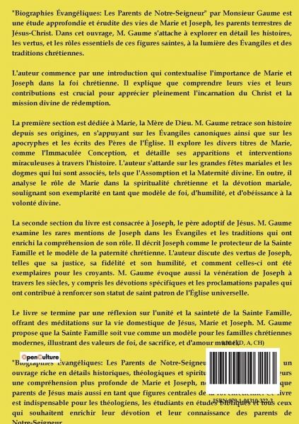 "Biographies Évangéliques: Les Parents de Notre-Seigneur" par Monsieur Gaume est une étude approfondie et érudite des vies de Marie et Joseph, les parents terrestres de Jésus-Christ. Dans cet ouvrage, M. Gaume s'attache à explorer en détail les histoires, les vertus, et les rôles essentiels de ces figures saintes, à la lumière des Évangiles et des traditions chrétiennes. L'auteur commence par une introduction qui contextualise l'importance de Marie et Joseph dans la foi chrétienne. Il explique que comprendre leurs vies et leurs contributions est crucial pour apprécier pleinement l'incarnation du Christ et la mission divine de rédemption. La première section est dédiée à Marie, la Mère de Dieu. M. Gaume retrace son histoire depuis ses origines, en s'appuyant sur les Évangiles canoniques ainsi que sur les apocryphes et les écrits des Pères de l'Église. Il explore les divers titres de Marie, comme l'Immaculée Conception, et détaille ses apparitions et interventions miraculeuses à travers l'histoire. L'auteur s'attarde sur les grandes fêtes mariales et les dogmes qui lui sont associés, tels que l'Assomption et la Maternité divine. En outre, il analyse le rôle de Marie dans la spiritualité chrétienne et la dévotion mariale, soulignant son exemplarité en tant que modèle de foi, d'humilité, et d'obéissance à la volonté divine. La seconde section du livre est consacrée à Joseph, le père adoptif de Jésus. M. Gaume examine les rares mentions de Joseph dans les Évangiles et les traditions qui ont enrichi la compréhension de son rôle. Il décrit Joseph comme le protecteur de la Sainte Famille et le modèle de la paternité chrétienne. L'auteur discute des vertus de Joseph, telles que sa justice, sa fidélité et son humilité, et comment celles-ci ont été exemplaires pour les croyants. M. Gaume évoque aussi la vénération de Joseph à travers les siècles, y compris les dévotions spécifiques et les proclamations papales qui ont contribué à renforcer son statut de saint patron de l'Église universelle. Le livre se termine par une réflexion sur l'unité et la sainteté de la Sainte Famille, offrant des méditations sur la vie domestique de Jésus, Marie et Joseph. M. Gaume propose que la Sainte Famille soit vue comme un modèle pour les familles chrétiennes modernes, illustrant des valeurs de foi, de sacrifice, et d'amour mutuel. "Biographies Évangéliques: Les Parents de Notre-Seigneur" par M. Gaume est un ouvrage riche en détails historiques, théologiques et spirituels. Il fournit aux lecteurs une compréhension plus profonde de Marie et Joseph, non seulement en tant que parents de Jésus mais aussi en tant que figures centrales de la foi chrétienne. Ce livre est indispensable pour les théologiens, les étudiants en études bibliques et tous ceux qui souhaitent enrichir leur dévotion et leur connaissance des parents de Notre-Seigneur.