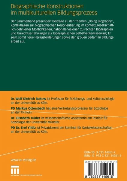 Dr. Wolf-Dietrich Bukow ist Professor für Erziehungs- und Kultursoziologie an der Universität zu Köln. PD Markus Ottersbach hat eine Vertretungsprofessur für Soziologie an der FH Köln. Dr. Elisabeth Tuider ist wissenschaftliche Assistentin am Institut für Soziologie der Universität Münster. PD Dr. Erol Yildiz ist Privatdozent am Seminar für Sozialwissenschaften an der Universität zu Köln.