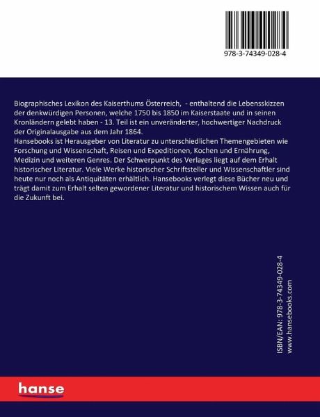 Biographisches Lexikon des Kaiserthums Österreich, - enthaltend die Lebensskizzen der denkwürdigen Personen, welche 1750 bis 1850 im Kaiserstaate und in seinen Kronländern gelebt haben - 13. Teil ist ein unveränderter, hochwertiger Nachdruck der Originalausgabe aus dem Jahr 1864.