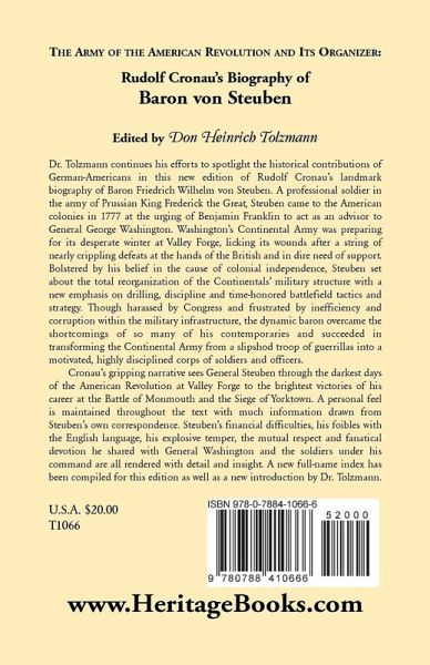 Dr. Tolzmann continues his efforts to spotlight the historical contributions of German-Americans in this new edition of Rudolf Cronau's landmark biography of Baron Friedrich Wilhelm von Steuben. A professional soldier in the army of Prussian King Frederick the Great, Steuben came to the American colonies in 1777 at the urging of Benjamin Franklin to act as an advisor to Gen. George Washington. Washington's Continental Army was preparing for its desperate winter at Valley Forge, licking its wounds after a string of nearly crippling defeats at the hands of the British and in dire need of support. Bolstered by his belief in the cause of colonial independence, Steuben set about the total reorganization of the Continentals' military structure with a new emphasis on drilling, discipline and time-honored battlefield tactics and strategy. Though harassed by Congress and frustrated by inefficiency and corruption within the military infrastructure, the dynamic baron overcame the shortcomings of so many of his contemporaries and succeeded in transforming the Continental Army from a slipshod troop of guerrillas into a motivated, highly disciplined corps of soldiers and officers. Cronau's gripping narrative sees General Steuben through the darkest days of the American Revolution at Valley Forge to the brightest victories of his career at the Battle of Monmouth and the Siege of Yorktown. A personal feel is maintained throughout the text with much information drawn from Steuben's own correspondence. Steuben's financial difficulties, his foibles with the English language, his explosive temper, the mutual respect and fanatical devotion he shared with General Washington and the soldiers under his command are all rendered with detail and insight. A new fullname index has been compiled for this edition as well as a new introduction by Dr. Tolzmann.