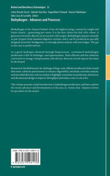 Chapter 1: Introduction to Biohydrogen: Advancements, Challenges, and Perspectives of the Cleanest Biofuel.- Chapter 2: Molecular Hydrogen (H2) Metabolism in Microbes: A special focus on biohydrogen production.- Chapter 3: Biohydrogen: Microbiology and Microbial Dynamics in Dark Fermentation.- Chapter 4: Biohydrogen Production in Anaerobic Reactors.- Chapter 5: Biohydrogen production by mono- versus co- and mixed cultures.- Chapter 6: Biohydrogen production by photosynthetic microorganisms.- Chapter 7: Metabolic engineering and synthetic biology in biohydrogen production.- Chapter 8: Substrate composition and effects on biohydrogen production.- Chapter 9: Biomass immobilization in biohydrogen production.- Chapter 10:Enhancement of biohydrogen production using chemical additives and nanoparticles.- Chapter 11: Feedstocks and cases I - Biohydrogen production from agroindustrial wastes - pretreatment, process engineering and techno-economic analysis.- Chapter 12: Feedstocks and cases II - Bioprocessing of domestic wastewater and sewage sludge for biohydrogen production: different routes and pretreatment strategies.- Chapter 13: Feedstocks and cases III - Biohydrogen from algal biomass (macro and microalgae).- Chapter 14: Biohythane production.- Chapter 15: Volatile fatty acids production and recovery in biohydrogen production.- Chapter 16: Biohydrogen and polyhydroxyalkanoates coupled production.- Chapter 17: Microbial electrolysis cells for biohydrogen production from effluents.- Chaper 18: Gas mass transfer and system pressure in biohydrogen production.- Chapter 19: Computational modelling and optimization strategies for biohydrogen production.- Chapter 20: Various routes for hydrogen production and its utilization for sustainable economy.- Chapter 21: Biohydrogen downstream processing and storage systems.- Chapter 22: A Life cycle assessment and economic perspective of biohydrogen production.- Chapter 23: Biohydrogen and the circular economy: Insertion of biohydrogen production in biorefineries aiming at zero-waste processes.- Chapter 24: Patents in biohydrogen production.