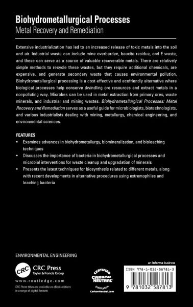 Extensive industrialization has led to an increased release of toxic metals into the soil and air. Industrial waste can include mine overburden, bauxite residue, and E waste, and these can serve as a source of valuable recoverable metals. There are relatively simple methods to recycle these wastes, but they require additional chemicals, are expensive, and generate secondary waste that causes environmental pollution. Biohydrometallurgical processing is a cost-effective and ecofriendly alternative where biological processes help conserve dwindling ore resources and extract metals in a nonpolluting way. Microbes can be used in metal extraction from primary ores, waste minerals, and industrial and mining wastes. Biohydrometallurgical Processes: Metal Recovery and Remediation serves as a useful guide for microbiologists, biotechnologists, and various industrialists dealing with mining, metallurgy, chemical engineering, and environmental sciences.