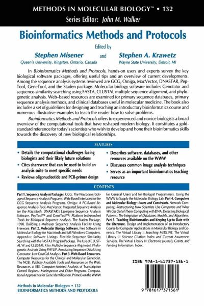 Computers have become an essential component of modern biology. They help to manage the vast and increasing amount of biological data and continue to play an integral role in the discovery of new biological relationships. This in silico approach to biology has helped to reshape the modern biological sciences. With the biological revolution now among us, it is imperative that each scientist develop and hone today's bioinformatics skills, if only at a rudimentary level. Bioinformatics Methods and Protocols was conceived as part of the Methods in Molecular Biology series to meet this challenge and to provide the experienced user with useful tips and an up-to-date overview of current developments. It builds upon the foundation that was provided in the two-volume set published in 1994 entitled Computer Analysis of Sequence Data. We divided Bioinformatics Methods and Protocols into five parts, including a thorough survey of the basic sequence analysis software packages that are available at most institutions, as well as the design and implemen- tion of an essential introductory Bioinformatics course. In addition, we included sections describing specialized noncommercial software, databases, and other resources available as part of the World Wide Web and a stimul- ing discussion of some of the computational challenges biologists now face and likely future solutions.