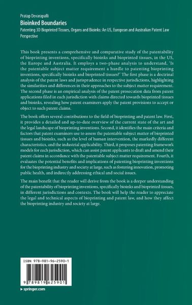 This book presents a comprehensive and comparative study of the patentability of bioprinting inventions, specifically bioinks and bioprinted tissues, in the US, the Europe and Australia. It employs a two-phase analysis to understand, 'Is the patentable subject matter requirement a hurdle to patenting bioprinting inventions, specifically bioinks and bioprinted tissues?' The first phase is a doctrinal analysis of the patent laws and jurisprudence in respective jurisdictions, highlighting the similarities and differences in their approaches to the subject matter requirement. The second phase is an empirical analysis of the patent prosecution data from patent applications filed in each jurisdiction with claims directed towards bioprinted tissues and bioinks, revealing how patent examiners apply the patent provisions to accept or object to such patent claims.
