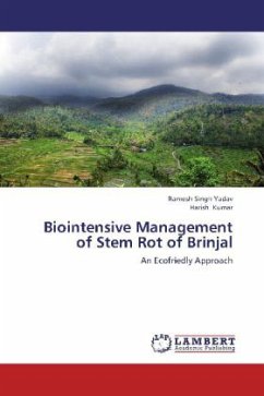 Stem rot of brinjal caused by Sclerotinia sclerotiorum (Lib.) de Bary is one of the most important disease of the crop. The symptoms caused by S. sclerotiorum first appear on stems when the plants were about flowering stage in the month of Jan.-Feb. and the temperature lies between 15-200 C, the affected parts of the stems become water soaked, turn brown and finally straw colored, followed by appearance of thick white mycelial mat on the affected surface and discoloration of the underlying tissues at the soil level. During integrated management the maximum disease incidence was reduced with the treatment F.Y.M. @ 8.0 tonnes/hectare + Trichoderma harzianum @ 5 kg /hectare (58.99 per cent), followed by F.Y.M. @ 8.0 tonnes / + T. harzianum @ 2.5 kg/ha. + mycchorrhiza TERI @ 2.5 kg/ha, resulted reduced the disease incidence (50.21 %) and also increased in yield, 36.42 per cent and 30.05 per cent respectively.
