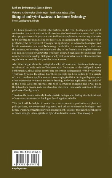This book provides technical information on different biological and hybrid wastewater treatment systems for the treatment of wastewater and reuse, and tracks their progress towards practical and field-scale applications including strategies to be adopted for minimizing the losses and maximizing the benefits, as well as protecting the environment through the application of advanced biological and hybrid wastewater treatment Technology. In addition, it discusses the crucial parts that science, technology, and innovation play in the formulation, implementation, and administration of wastewater treatment policy. It highlights the challenges that must be overcome to adopt biological and hybrid wastewater treatment infrastructure regulations successfully and provides some answers.