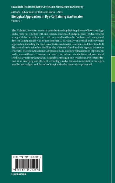 Dye removal using activated sludge.- Fundamental concepts of dye-containing textile wastewater treatments: microbial and enzymatic approaches.- Role of microbial biofilms in dye degradation during textile wastewater treatment.- Biotransformation of anthraquinone dye by microbial enzymes.- Microalgae-Based Remediation Approaches in Textile Dye Removal.- Plant-Microbe-Based Remediation Approaches in Dye Removal.- Role of fungi in the removal of synthetic dyes from textile industry effluents.- The Applicability of the Microalgae-Based Systems in Textile Dye Industrial Wastewater.- Potential for Constructed Wetlands Aimed at Sustainable Wastewater Treatment, Reuse, and Disposal in Dyestuff and Textile Sectors.