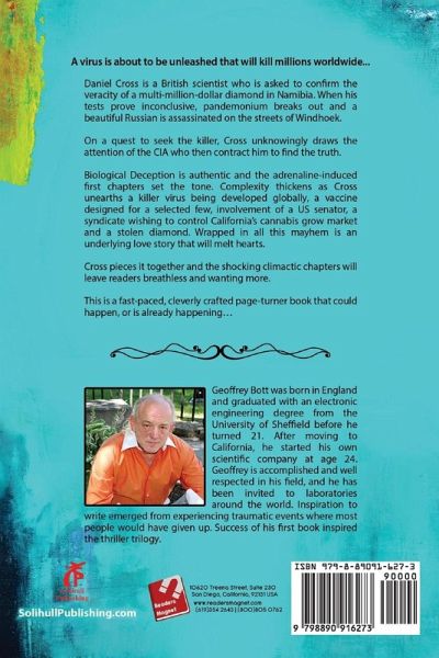 Daniel Cross is a British scientist who is asked to confirm the veracity of a multi-million-dollar diamond in Namibia. When his tests prove inconclusive, pandemonium breaks out and a beautiful Russian is assassinated on the streets of Windhoek. On a quest to seek the killer, Cross unknowingly draws the attention of the CIA who then contract him to find the truth. Biological Deception is authentic and the adrenaline-induced first chapters set the tone. Complexity thickens as Cross unearths a killer virus being developed globally, a vaccine designed for a select few, involvement of a US senator, a syndicate wishing to control California's cannabis grow market and a stolen diamond. Wrapped in all this mayhem is an underlying love story that will melt hearts. Cross pieces it together and the shocking climactic chapters will leave readers breathless and wanting more. This is a fast-paced, cleverly crafted page-turner that could happen, or is already happening...