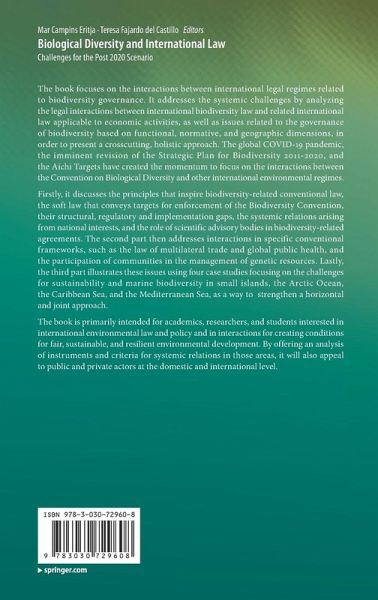 The book focuses on the interactions between international legal regimes related to biodiversity governance. It addresses the systemic challenges by analyzing the legal interactions between international biodiversity law and related international law applicable to economic activities, as well as issues related to the governance of biodiversity based on functional, normative, and geographic dimensions, in order to present a crosscutting, holistic approach. The global COVID-19 pandemic, the imminent revision of the Strategic Plan for Biodiversity 2011-2020, and the Aichi Targets have created the momentum to focus on the interactions between the Convention on Biological Diversity and other international environmental regimes.