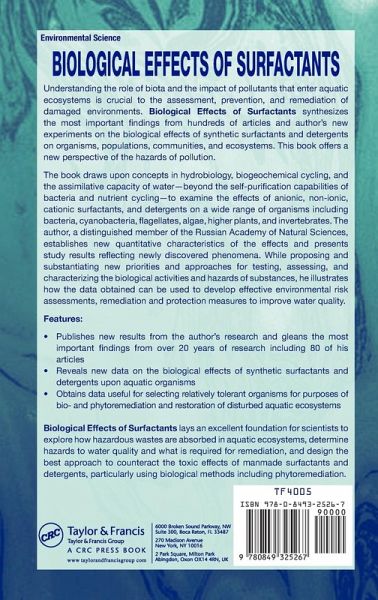 Biological Effects of Surfactants examine the effects of anionic, non-ionic, cationic surfactants, and detergents on a wide range of organisms-including bacteria, cyanobacteria, flagellates, algae, higher plants, and invertebrates-populations, communities, and ecosystems. The author establishes new quantitative characteristics of the effects and presents study results on newly discovered phenomena. While proposing and substatiating new approaches for testing, assessing, and characterizing the biological activities and hazards of substances, the book illustrates how the data obtained can be used to develop effective environmental remediation and protection measures to improve water quality.