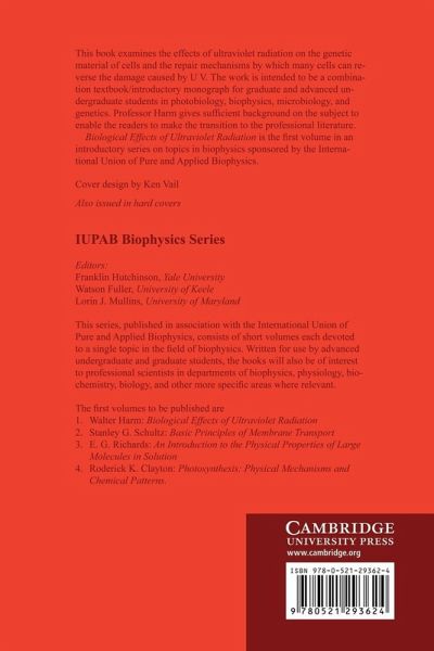Originally published in 1980, this book examines the effects of ultraviolet radiation on the genetic material of cells and the repair mechanisms by which many cells can reverse the damage caused by UV. The work was intended to be a combination textbook/introductory monograph for graduate and advanced undergraduate students in photobiology, biophysics, microbiology, and genetics. It was the first volume in an introductory series on topics in biophysics sponsored by the International Union of Pure and Applied Biophysics.
