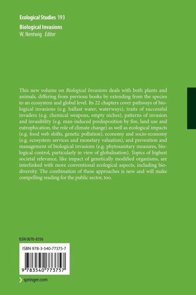 Biological Invasions: why it Matters.- Biological Invasions: why it Matters.- Pathways of Biological Invasions.- Pathways in Animal Invasions.- Pathways in Plant Invasions.- Is Ballast Water a Major Dispersal Mechanism for Marine Organisms?.- Waterways as Invasion Highways - Impact of Climate Change and Globalization.- Traits of a Good Invader.- Integrating Ecological and Evolutionary Theory of Biological Invasions.- Traits Associated with Invasiveness in Alien Plants: Where Do we Stand?.- Do Successful Invaders Exist? Pre-Adaptations to Novel Environments in Terrestrial Vertebrates.- Patterns of Invasion and Invasibility.- Effects of Land Management Practices on Plant Invasions in Wildland Areas.- Nitrogen Enrichment and Plant Invasions: the Importance of Nitrogen-Fixing Plants and Anthropogenic Eutrophication.- From Ecosystem Invasibility to Local,Regional and Global Patterns of Invasive Species.- Will Climate Change Promote Alien Plant Invasions?.- Ecological Impact of Biological Invasions.- Impacts of Invasive Species on Ecosystem Services.- Biological Invasions by Marine Jellyfish.- Effects of Invasive Non-Native Species on the Native Biodiversity in the River Rhine.- Hybridization and Introgression Between Native and Alien Species.- Genetically Modified Organisms as Invasive Species?.- Economy and Socio-Economy of Biological Invasions.- Plant,Animal, and Microbe Invasive Species in the United States and World.- Socio-Economic Impact and Assessment of Biological Invasions.- Prevention and Management of Biological Invasions.- Economic Analysis of Invasive Species Policies.- Phytosanitary Measures to Prevent the Introduction of Invasive Species.- Limits and Potentialities of Eradication as a Tool for Addressing Biological Invasions.- Pros and Cons of BiologicalControl.- General Conclusion, or what Has to be Done now?.
