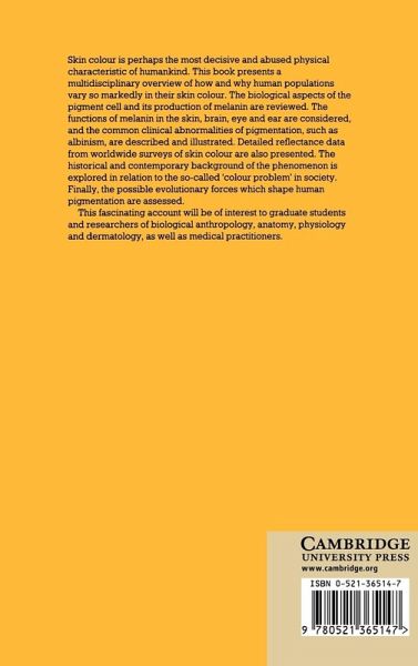 Skin colour is perhaps the most decisive and abused physical characteristic of humankind. This book presents a multidisciplinary overview of how and why human populations vary so markedly in their skin colour. The biological aspects of the pigment cell and its production of melanin are reviewed. The functions of melanin in the skin, brain, eye and ear are considered, and the common clinical abnormalities of pigmentation, such as albinism, are described and illustrated. Detailed reflectance data from worldwide surveys of skin colour are also presented. The historical and contemporary background of the phenomenon is explored in relation to the so-called 'colour problem' in society. Finally, the possible evolutionary forces which shape human pigmentation are assessed. This fascinating account will be of interest to graduate students and researchers of biological anthropology, anatomy, physiology and dermatology, as well as medical practitioners.