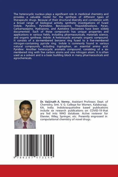 The heterocyclic nucleus plays a significant role in medicinal chemistry and provides a valuable model for the synthesis of different types of therapeutic drugs. Because of their structural diversity and correlation with a broad range of biological activity, synthetic investigations of fused Indole, Pyridine, Pyrimidine, Benzoxazine, Thiazolidinedione, Pyran, Carbamazepine, Hydrazone, and Azetidine Derivatives have been widely documented. Each of these compounds has unique properties and applications in various fields, including pharmaceuticals, materials science, and organic synthesis. Indole: A heterocyclic aromatic organic compound. It consists of a six-membered benzene ring fused to a five-membered nitrogen-containing pyrrole ring. Indole is commonly found in various natural compounds, including tryptophan, an essential amino acid. Pyridine: Another heterocyclic aromatic compound, consisting of a six-membered ring with five carbon atoms and one nitrogen atom. It is often usedas a solvent and is a basic building block in many pharmaceuticals and agrochemicals.
