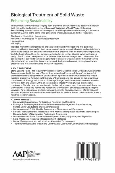 Elena Cristina Rada, PhD, earned her master's degree in environmental engineering from the Politehnica University of Bucharest, Romania; she received a PhD in environmental engineering and a second PhD in power engineering from the University of Trento, Italy, and the Politehnica University of Bucharest. Her post-doc work was in sanitary engineering from the University of Trento, Italy. She has been a professor in the Municipal Solid Waste master's program at Politehnica University of Bucharest, and has served on the organizing committees of "Energy Valorization of Sewage Sludge," an international conference held in Rovereto, Italy, and Venice 2010, an International Waste Working Group international conference. She also teaches seminars in the bachelor, master, and doctorate modules in the University of Trento and Padua and Politehnica University of Bucharest and has managed university funds at national and international levels. Dr. Rada is a reviewer of international journals, a speaker at many international conferences, and the author or co-author of about 100 research papers. Her research interests are bio mechanical municipal solid waste treatments, biological techniques for biomass characterization, environmental and energy balances regarding municipal solid waste, indoor and outdoor pollution (prevention and remediation) and health, and innovative remediation techniques for contaminated sites and streams.