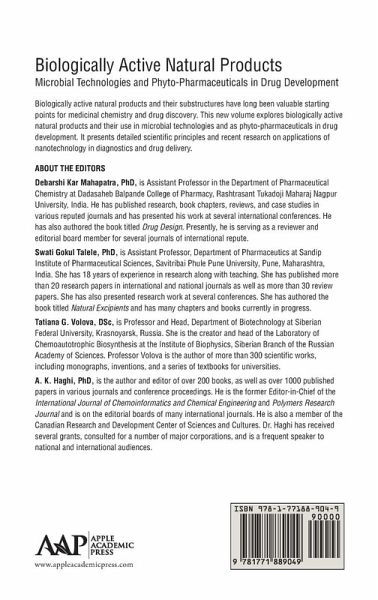 Debarshi Kar Mahapatra, PhD, is Assistant Professor in the Department of Pharmaceutical Chemistry at Dadasaheb Balpande College of Pharmacy, Rashtrasant Tukadoji Maharaj Nagpur University, India. He has published research, book chapters, reviews, and case studies in various reputed journals and has presented his work at several international conferences. He has also authored the book titled Drug Design. Presently, he is serving as a reviewer and editorial board member for several journals of international repute. Swati Gokul Talele, PhD, is Assistant Professor, Department of Pharmaceutics at Sandip Institute of Pharmaceutical Sciences, Savitribai Phule Pune University, Pune, Maharashtra, India. She has 18 years of experience in research along with teaching. She has published more than 20 research papers in international and national journals as well as more than 30 review papers. She has also presented research work at several conferences. She has authored the book titled Natural Excipients and has many chapters and books currently in progress. Tatiana G. Volova, DSc, is Professor and Head, Department of Biotechnology at Siberian Federal University, Krasnoyarsk, Russia. She is the creator and head of the Laboratory of Chemoautotrophic Biosynthesis at the Institute of Biophysics, Siberian Branch of the Russian Academy of Sciences. Professor Volova is the author of more than 300 scientific works, including monographs, inventions, and a series of textbooks for universities. A. K. Haghi, PhD, is the author and editor of over 200 books, as well as over 1000 published papers in various journals and conference proceedings. He is the former Editor-in-Chief of the International Journal of Chemoinformatics and Chemical Engineering and Polymers Research Journal and is on the editorial boards of many international journals. He is also a member of the Canadian Research and Development Center of Sciences and Cultures. Dr. Haghi has received several grants, consulted for a number of major corporations, and is a frequent speaker to national and international audiences.